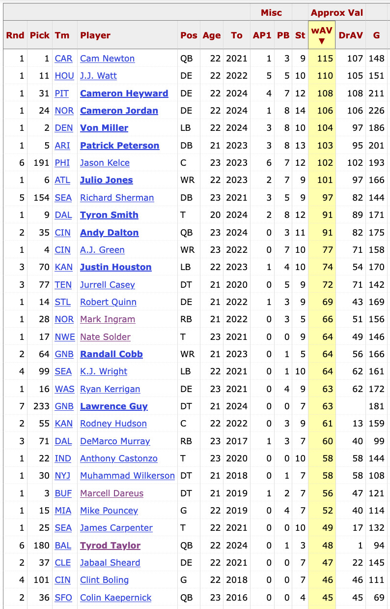 It’s wild that certain Hall of Famers Jason Kelce (Round 6) and Richard Sherman (Round 5) remained on the board until Day 3. Amukamara is tied for 40th in wAV for that class. (Note that wide receiver Doug Baldwin, who had a terrific career with Seattle and a 54 wAV, does not show up in the PFR wAV listing for this draft class because he was an undrafted free agent.)