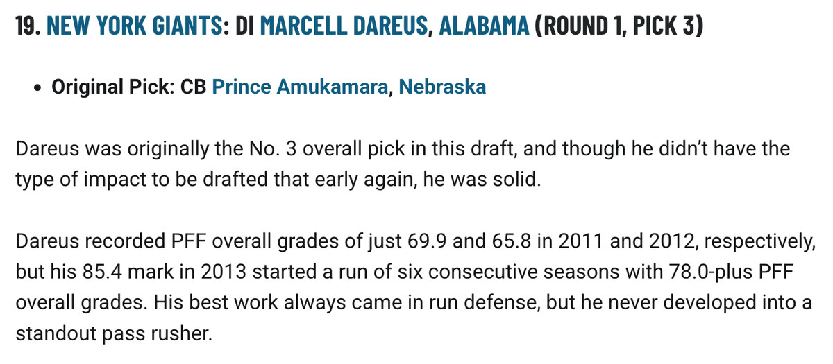 In their redraft, PFF chose defensive tackle Marcell Dareus, who actually went No. 3 to Buffalo, for the Giants instead of Amukamara. Dareus had a nice career start, giving the Bills some interior pass rush, but his career was marred by substance abuse problems that resulted in two suspensions and fell off after that:
