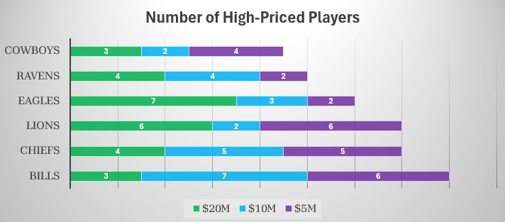 The chart above shows the number of players who make at least $20 million annually (green), more than $10 million but less than $20 million (blue), and at least $5 million but less than $10 million (purple). Some things jump out at you. The Eagles and Lions have a lot of players making at least $20 million. The Cowboys, in contrast, only have three (Prescott, Lamb, and Osa Odighizuwa).