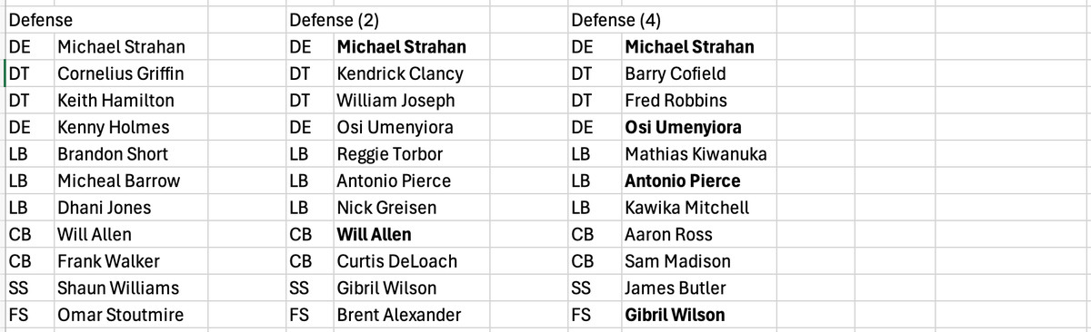 Here’s a summary of the primary players on the Giants roster in 2003, 2005, and 2007:
