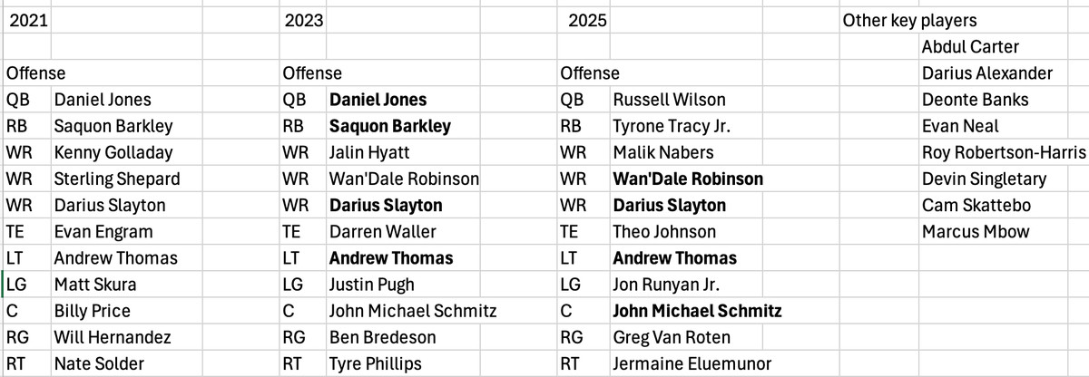What the present does have in common with the team from 20 years ago is apparent draft success. The 2024 draft looks after one season to have been a great success, with Malik Nabers having become an instant star and perhaps four other starters emerging. Likewise, every pick from the 2025 draft seems promising.