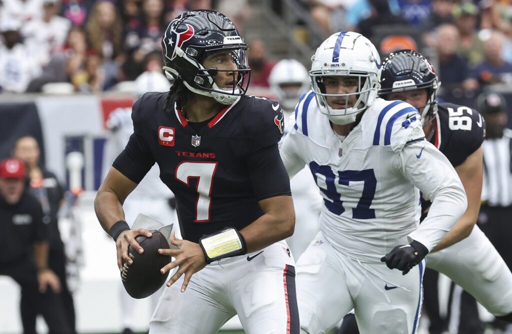 Oct 27, 2024; Houston, Texas, USA; Houston Texans quarterback C.J. Stroud (7) looks for an open receiver as Indianapolis Colts defensive end Laiatu Latu (97) applies defensive pressure during the game at NRG Stadium. Mandatory Credit: Troy Taormina-Imagn Images