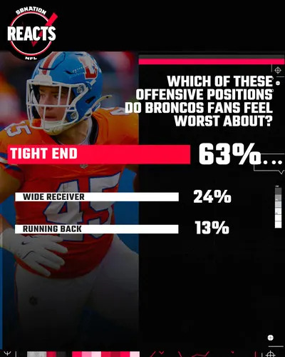 The results from this week’s FanDuel SB Nation Reacts survey shocked me a bit. Even with the J.K. Dobbins signing, I felt like the running back position group is still the one with the biggest question marks heading into the season for the Denver Broncos. However, most fans disagree with that assessment. 63% went with the tight end position group and another 24% went with the wide receiver group.