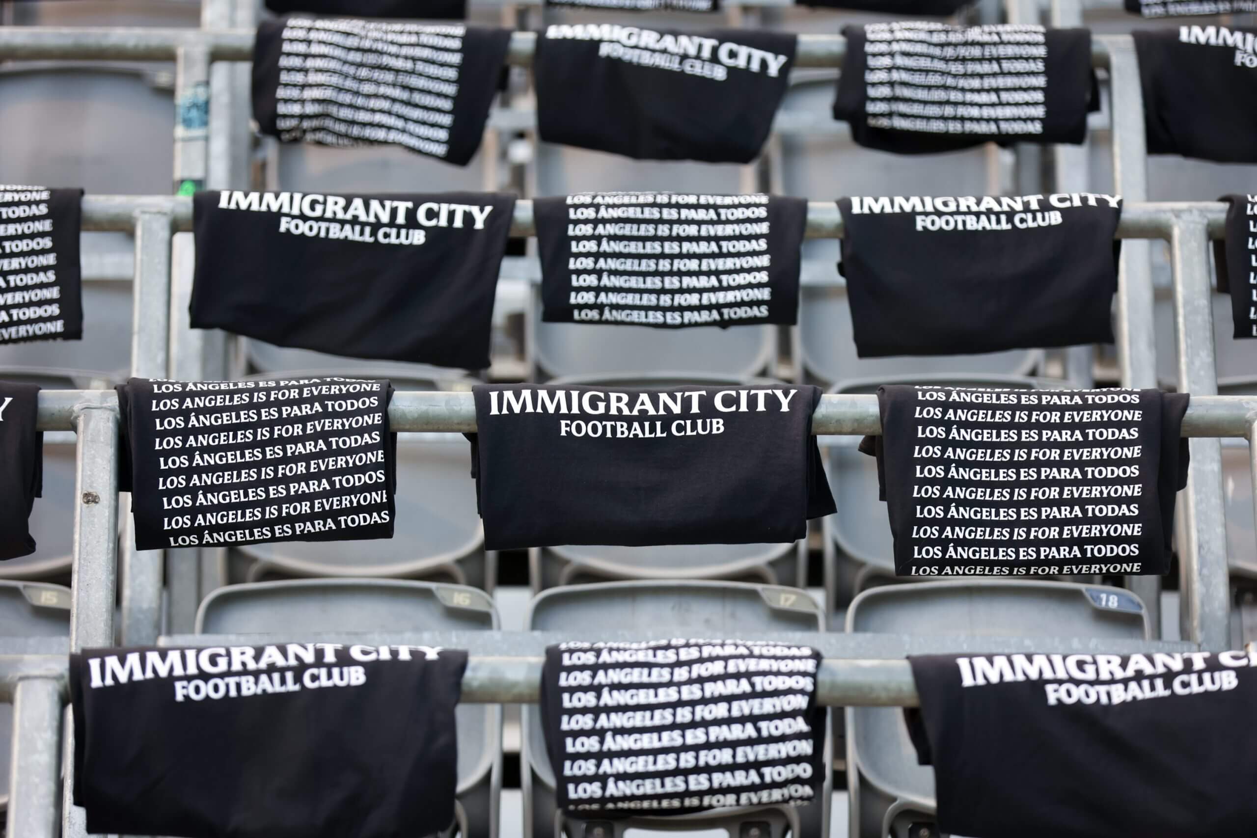 Angel City FC responded to immigration raids and the resulting protests in Los Angeles during Saturday night’s home match against North Carolina. The NWSL club printed 10,000 t-shirts which read “Immigrant City Football Club” on the front, and “Los Angeles is for everyone / Los Ángeles es para todos” on the back.