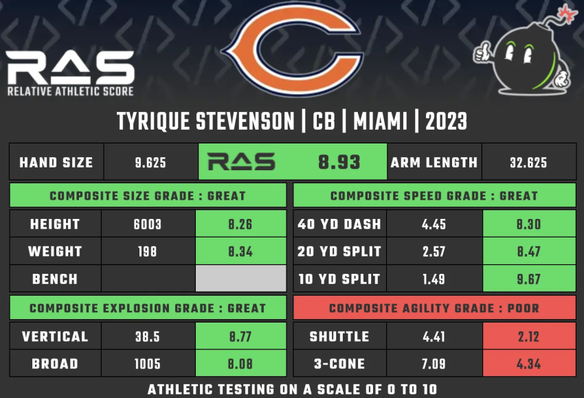 Tyrique Stevenson’s (RAS) Relative Athletic Score, per RAS.Football
