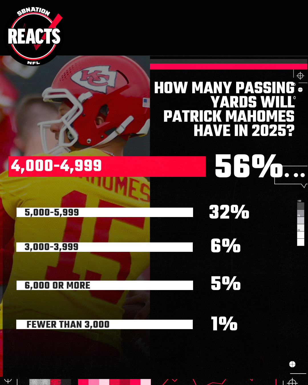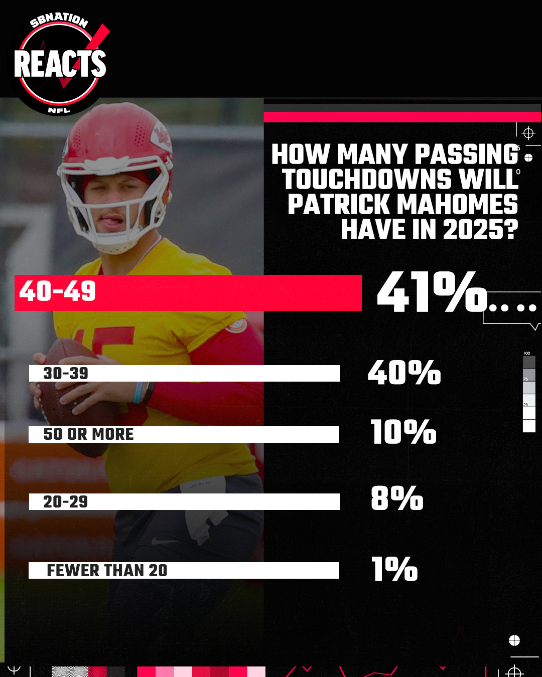 A smaller percentage of fans — just one in 10 — think Mahomes will again clear 50 touchdown passes. But a slight plurality (just over two in five) think he’ll connect for at least 40.