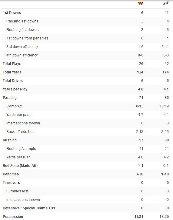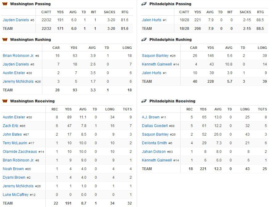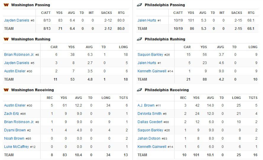 Thus far, Jayden Daniels was 3-4 for 37 yards, while Hurts was 4-10 for 42 yards and one sack for -2 yards. Both teams were running the ball well. The Eagles had 9 rushes for 38 yards; Washington had 6 carries for 33 yards and a touchdown. The Eagles had run more offensive plays, but trailed by 7 points.