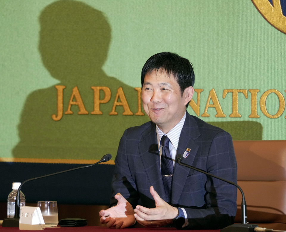 Japan football manager Hajime Moriyasu addresses the Japan National Press Club in Tokyo on June 16, 2025. (Kyodo)Â