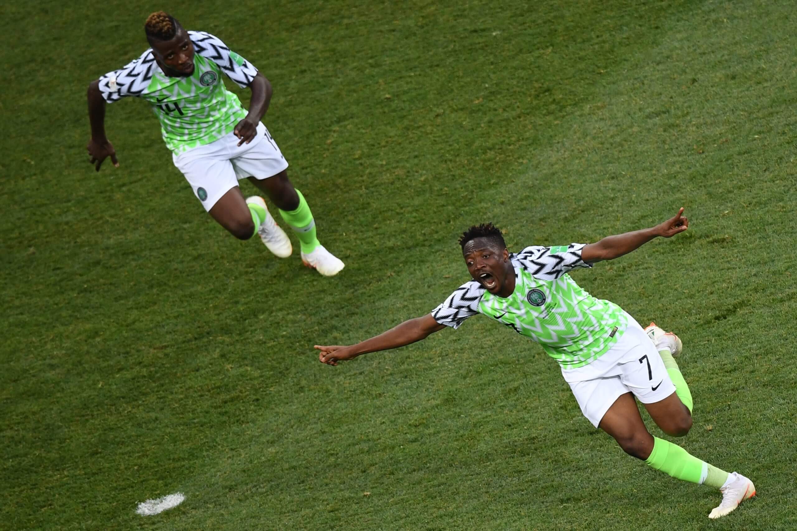 Ahmed Musa, right, celebrates scoring in Nigeria’s 2-0 win over Iceland at the 2018 World Cup (Philippe Desmazes/AFP via Getty Images)