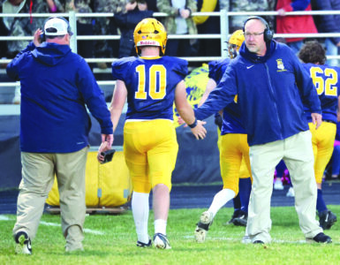 Negaunee head coach Paul Jacobson, right, congratulates quarterback Ty Jacobson for leading a Miners’ touchdown drive in the first quarter of a game played against Houghton at Miner Stadium in Negaunee on Oct. 18. Walking next to Ty Jacobson is his father and Negaunee assistant coach Kevin Jacobson, Paul Jacobson’s brother. (Photo courtesy Daryl T. Jarvinen)