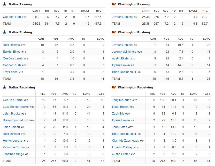Washington, needing a touchdown, opened the next offensive drive at the 31-yard line with 05:08 remaining. Jayden Daniels took to the air, and moved the ball handily. Noah Brown got the ball into Cowboys territory with a 19-yard gain to the Dallas 9-yard line, but Daniels took a sack on the next play.