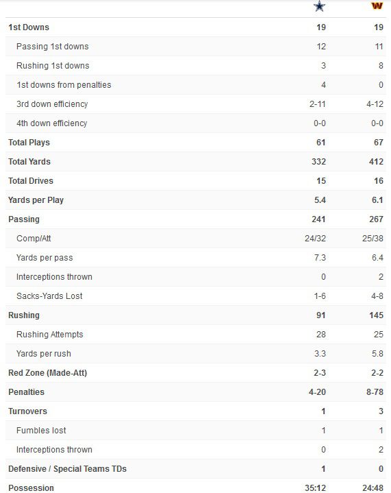 On 3rd & 4 at the 38-yard line, RB Rico Dowdle broke loose for a good run to pick up a Dallas first down at their 48-yard line. Three more plays earned two more 1st downs, and Dallas was in Washington territory at the 29-yard line.
