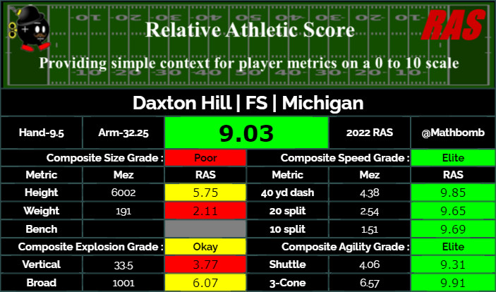 Hill played a blend of roles at Michigan, thriving in the slot and showcasing athleticism in other defensive back positions. He demonstrated strong pre-draft measurables, posting an RAS (Relative Athletic Score) over 9.0.