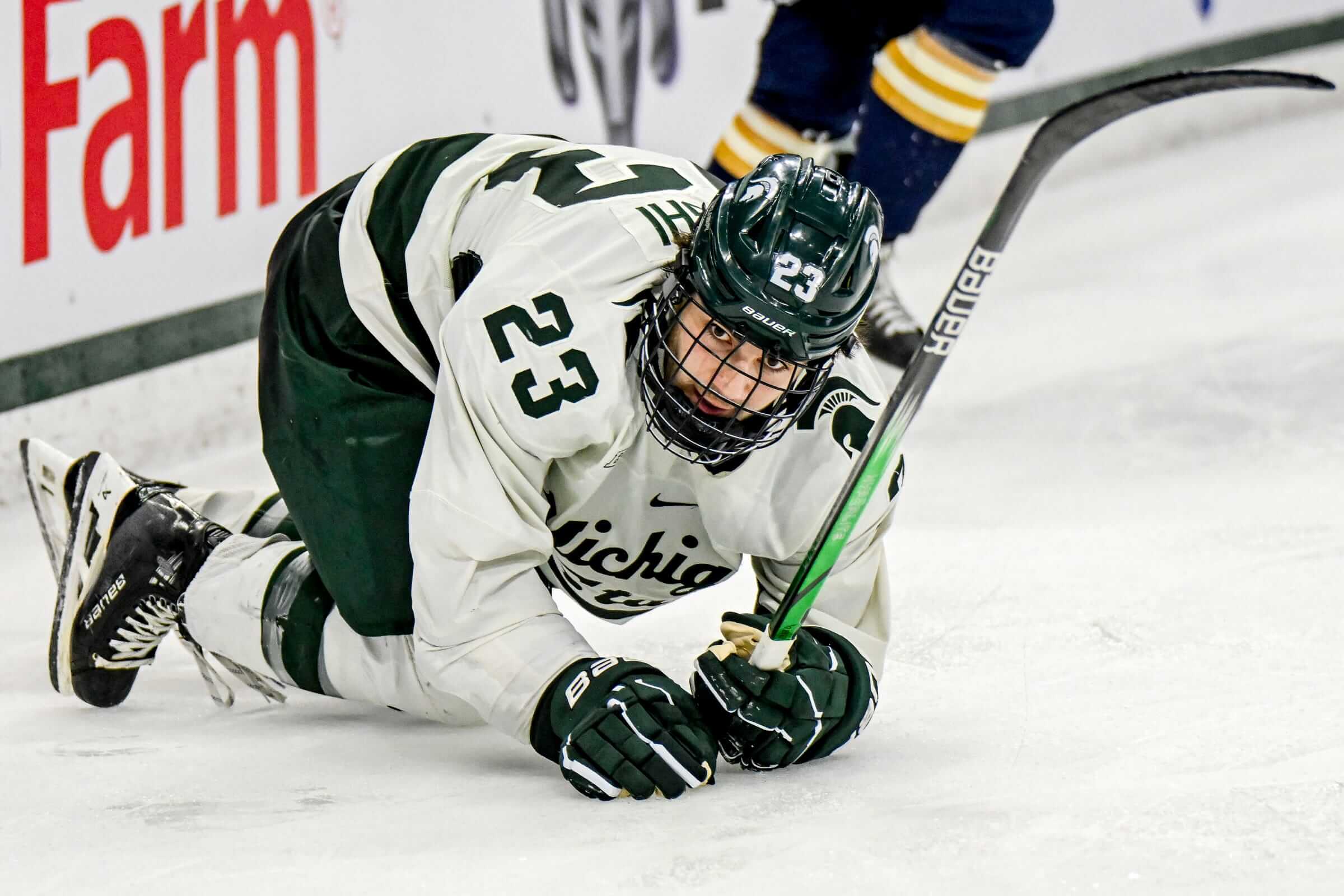 Michigan State’s Shane Vansaghi gets up off the ice after falling against Notre Dame during the second period in the Big Ten tournament on Saturday, March 15, 2025, at Muni Arena in East Lansing.Shane Vansaghi, C, Michigan State (NCAA), 6-foot-3, 212 pounds