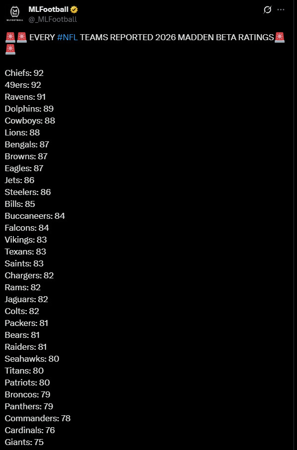 That said, this is a beta. Even for a game that offers minimal improvements, Electronic Arts—Madden’s developer and publisher—routinely scrambles lineups, playbooks, and even team ratings during this phase to prevent full leaks. EA could easily update the rankings later this summer as we get closer to launch. That’s exactly why we’re not going to get too deep into player ratings yet—everything could shift in a month. It’s also worth noting that some sites currently list the 49ers at 87 overall instead of 92, so the reshuffling may already be underway.