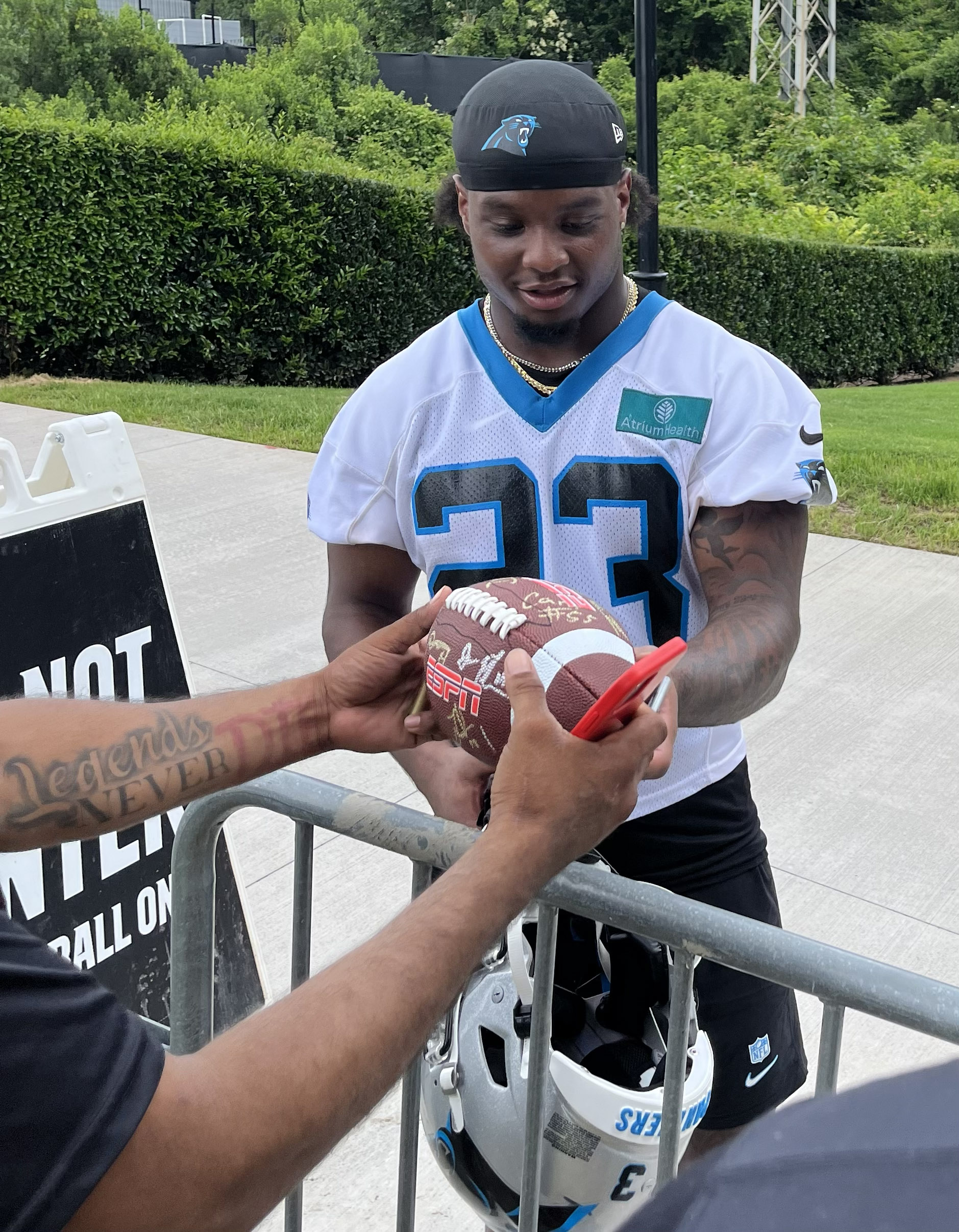 Carolina Panthers rookie running back Trevor Etienne signs a football for a fan June 12 at the Bank of America Stadium campus during minicamp.