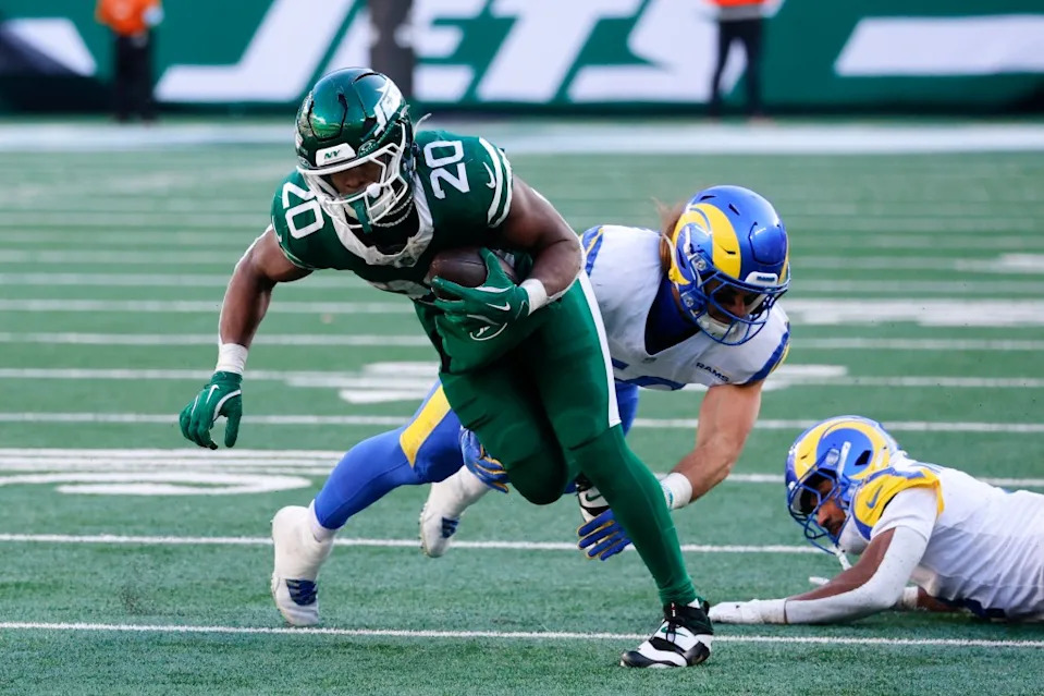 Breece Hall #20 of the New York Jets runs the ball as he breaks away Ahkello Witherspoon #4 of the Los Angeles Rams during the first half at Metlife Stadium, Sunday, Dec. 22, 2024, in East Rutherford, New Jersey. Corey Sipkin for the NY POST