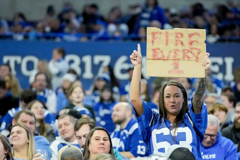 A Indianapolis Colts fan holds up a sign in the stands Sunday, Jan. 5, 2025, during a game against the Jacksonville Jaguars at Lucas Oil Stadium in Indianapolis.© Grace Hollars/IndyStar / USA TODAY NETWORK via Imagn Images