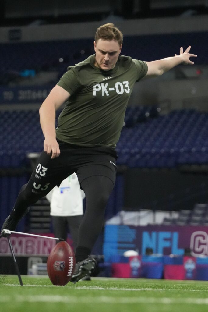 Mar 3, 2024; Indianapolis, IN, USA; Missouri place kicker Harrison Mevis (PK03) during the 2024 NFL Combine at Lucas Oil Stadium. Mandatory Credit: Kirby Lee-USA TODAY Sports