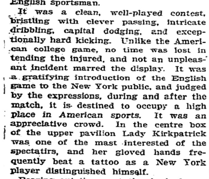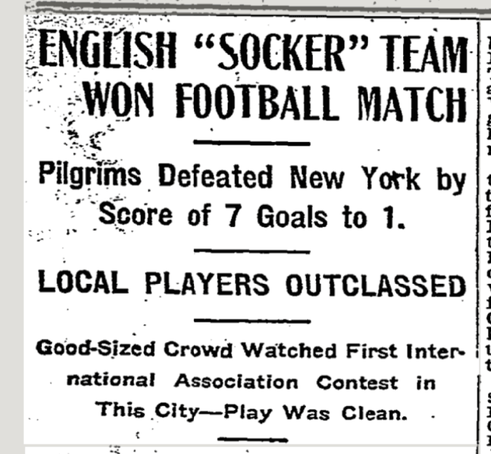 The first mention of soccer in the pages of the New York Times came on October 22, 1905, in a report of a game involving a team known as the Pilgrims, who had come over from England to promote the game in America. “English socker (sic) team won football match,” read the slightly confusing headline (above), followed by an account of the game at the Polo Grounds in New York that ended 7-1 to the English touring team, declaring it to be a “clean, well-played contest, bristling with clever passing, intricate dribbling, capital dodging and exceptionally hard kicking”. Capital dodging! Exceptionally hard kicking! Sounds like a jolly old show.