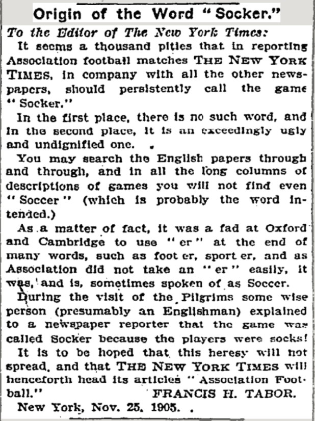 But the letter is instructive beyond the ramblings of a haughty pedant, because Mr Tabor (below) goes on to repeat the popular story about where the word came from, writing that it was “a fad at Oxford and Cambridge to use ‘er’ at the end of many words, such as foot-er, sport-er and as association did not take an ‘er’ easily, it was, and is, sometimes spoken of as soccer”. This indicates that the Wreford-Brown origin story is relatively solid.