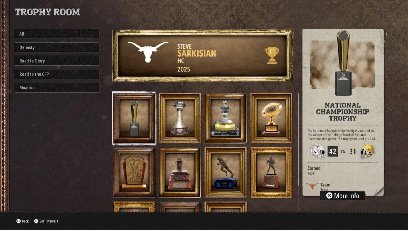 The Trophy Room is back, though I didn’t get to test it in beta. The game includes more history, like every winner of every conference championship and individual trophy. Game commentators will update you on scores across the country. You can customize max transfers per team and wear and tear. What about the experience changes do you like most?