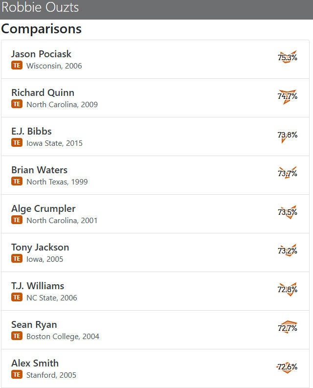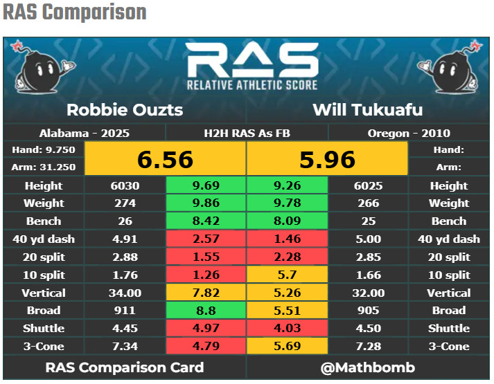 Ouzts is actually a little bigger than Tukuafu, a converted DL. The rest of the scores are pretty close with Ouzts performing slightly better in most categories.
