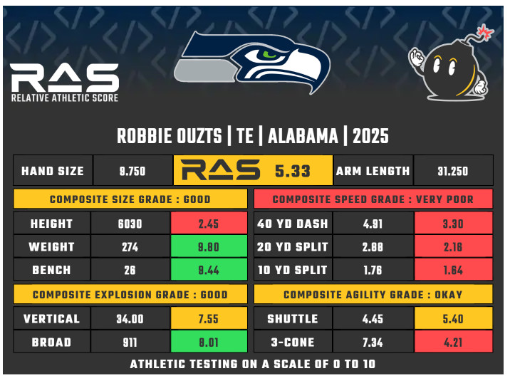 Mockdraftable and the first RAS chart above are based on Ouzts as a TE, which was his position in college. Obviously, we know he’s going to be a FB for the Seahawks so the second RAS chart and accompanying comps are more relevant. Overall, Ouzts is an “okay” athlete as a FB with great size and explosion. As long as he can block, who really cares?