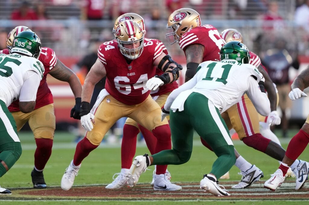 Sep 9, 2024; Santa Clara, California, USA; San Francisco 49ers center Jake Brendel (64) blocks against New York Jets linebacker Jermaine Johnson (11) during the second quarter at Levi’s Stadium. Mandatory Credit: Darren Yamashita-Imagn Images