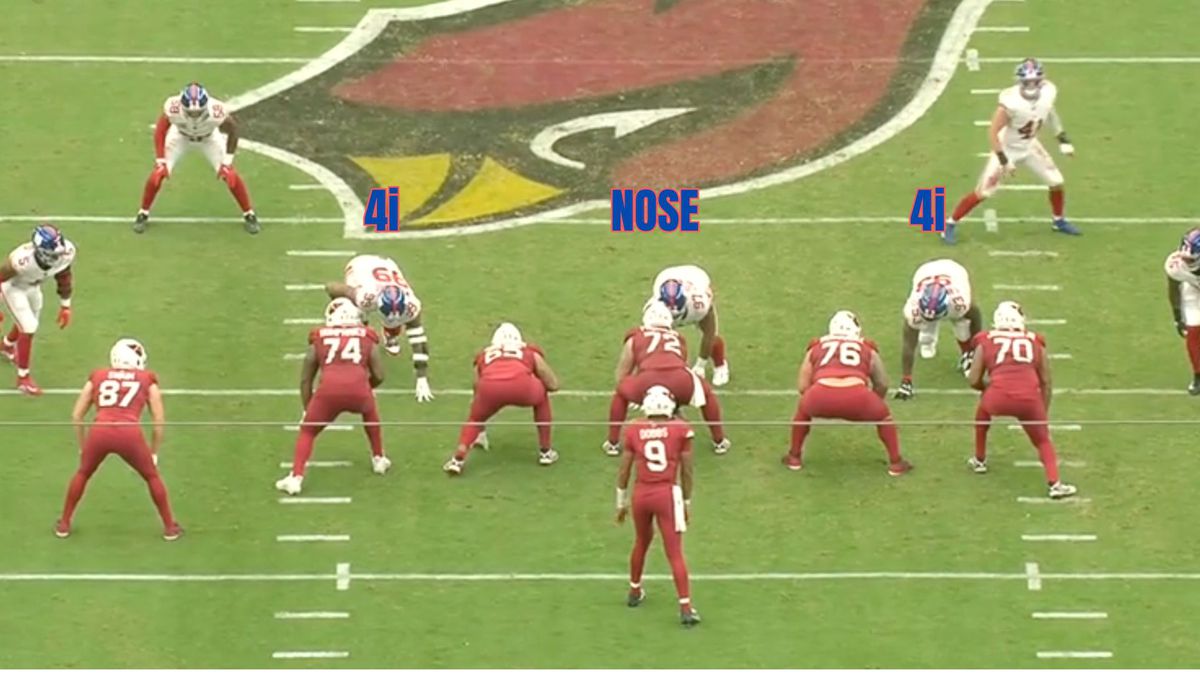 As we see above, Martindale used 4i-shades for width over the three techniques. Either usage would occupy all the interior gaps and force the offense to spill runs outside for the linebackers and force defenders.