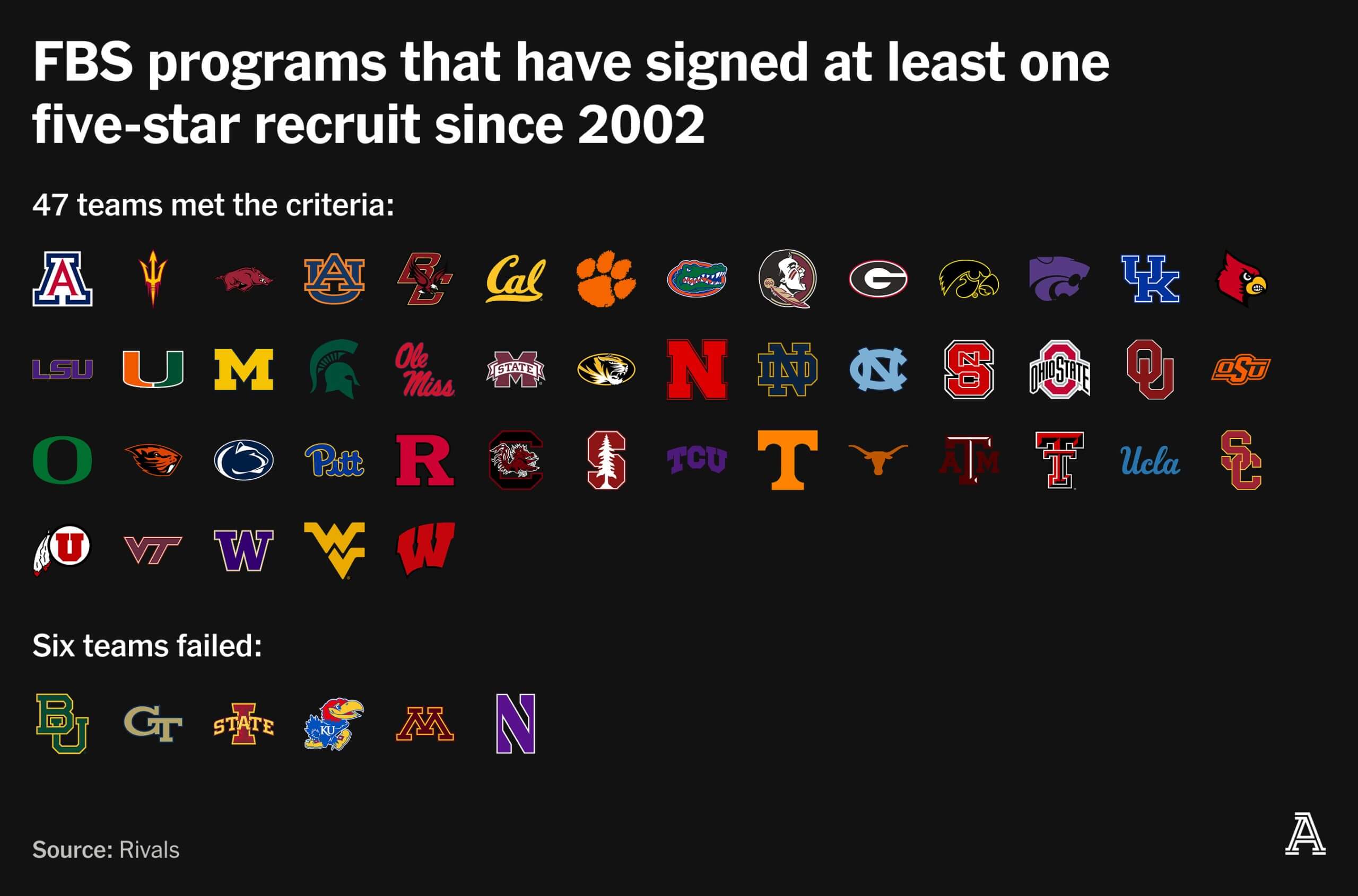 This one is slightly arbitrary but simple. Even though Saban is a historically great recruiter, it’s unrealistic to expect him to sign several elite prospects annually at a school that has no track record of doing so. Our proof-of-concept requirement: at least one five-star signee in any of the 24 classes of the modern recruiting era.