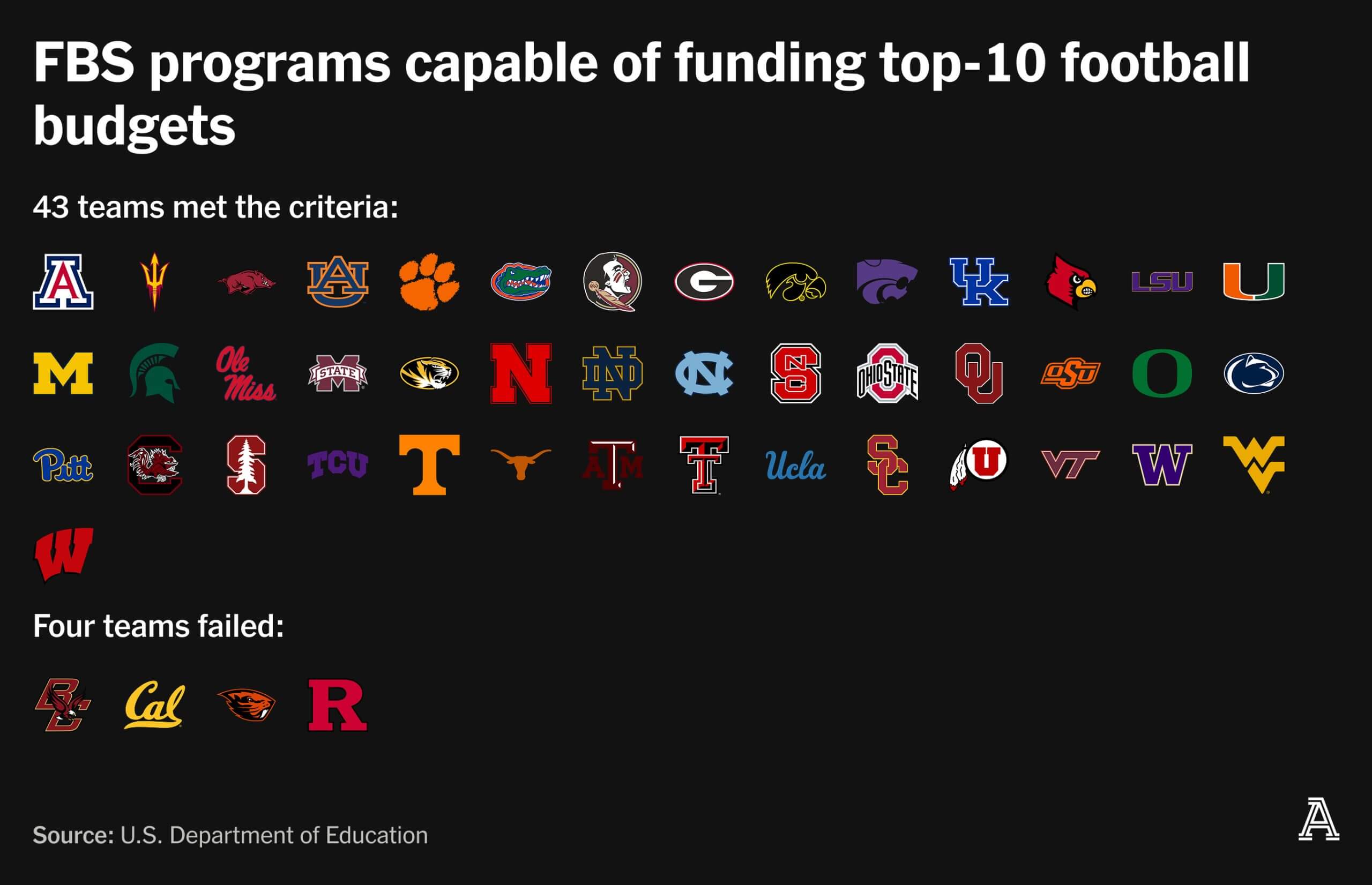 Because fiscal years don’t overlap cleanly with football seasons, the numbers are squishy. But almost every national champion since 2005 has ranked among the top 10 in football expenses around its title run. A 38 percent increase in football revenue still wasn’t enough to jolt the budgets of Boston College, Cal, Oregon State and Rutgers consistently to that level. We’ll assume they can’t give Saban the resources he demands, so they’re the next group to go.
