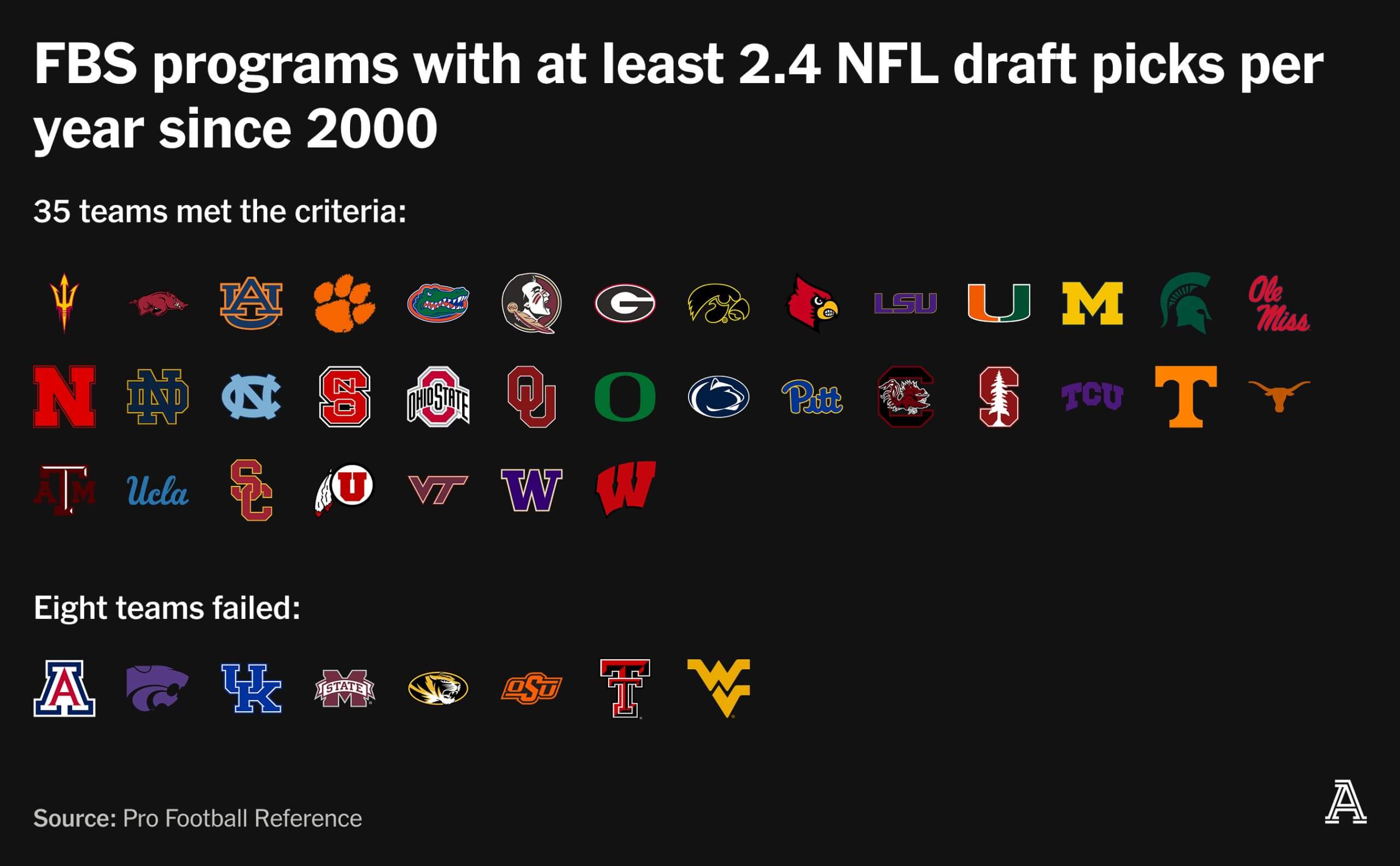 This factor knocks out Arizona, Kansas State, Kentucky, Mississippi State, Missouri, Oklahoma State, Texas Tech and West Virginia, the flagship school of Saban’s home state. Our list is down to 35, with Arizona State (2.46 picks per year) barely squeaking through.