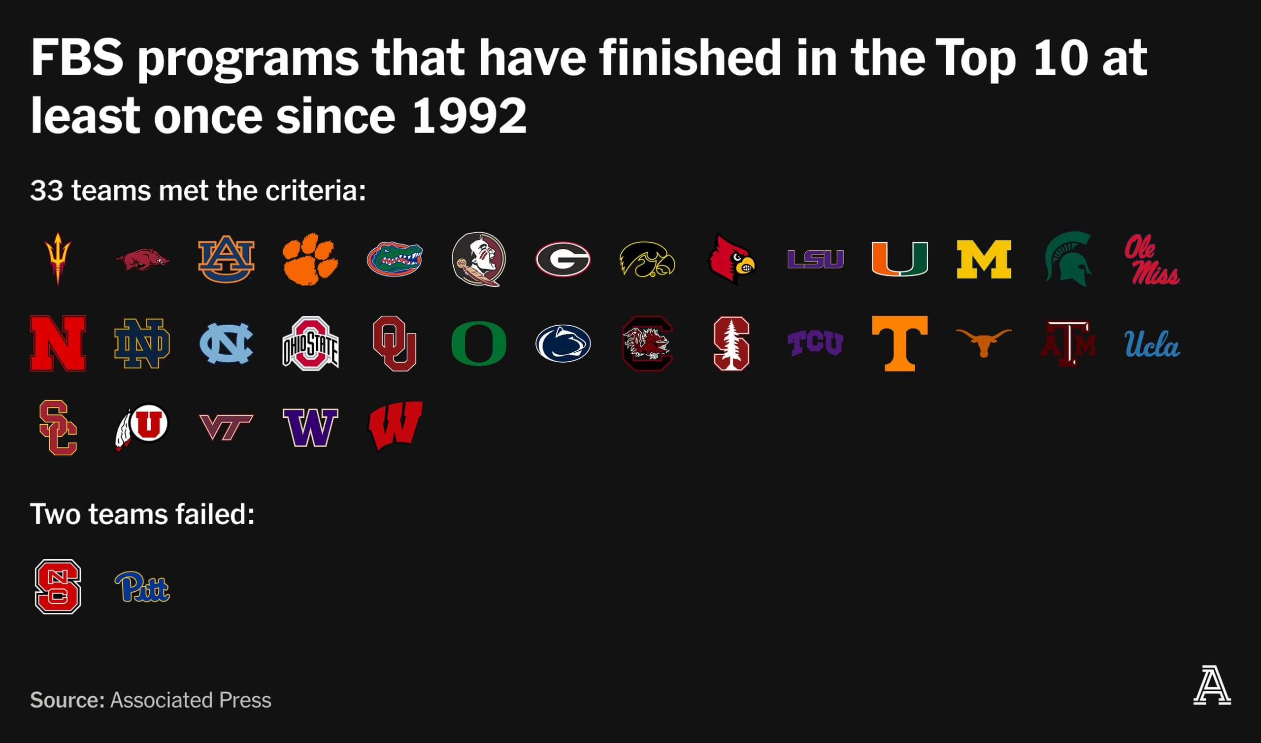 Our proof-of-concept bar is lower. We mandated at least one AP top-10 finish since 1992 (the year of Alabama’s last pre-Saban crown). That means we must say goodbye to Pitt and North Carolina State, the latter of which has never finished in the top 10.