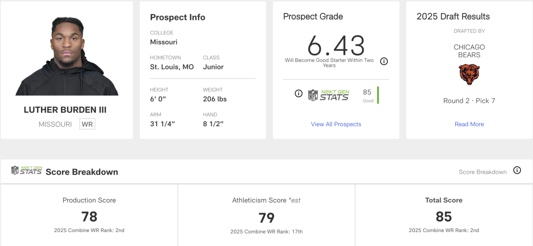 Keenan Allen’s departure robbed the Bears of 121 targets in the slot from 2024 — he had 70 catches, 744 yards, 7 TDs, according to PFF. That’s a huge vacuum. Veteran Olamide Zaccheaus can fill in as backup, sure — but nobody’s primed like Burden, and the door’s wide open.
