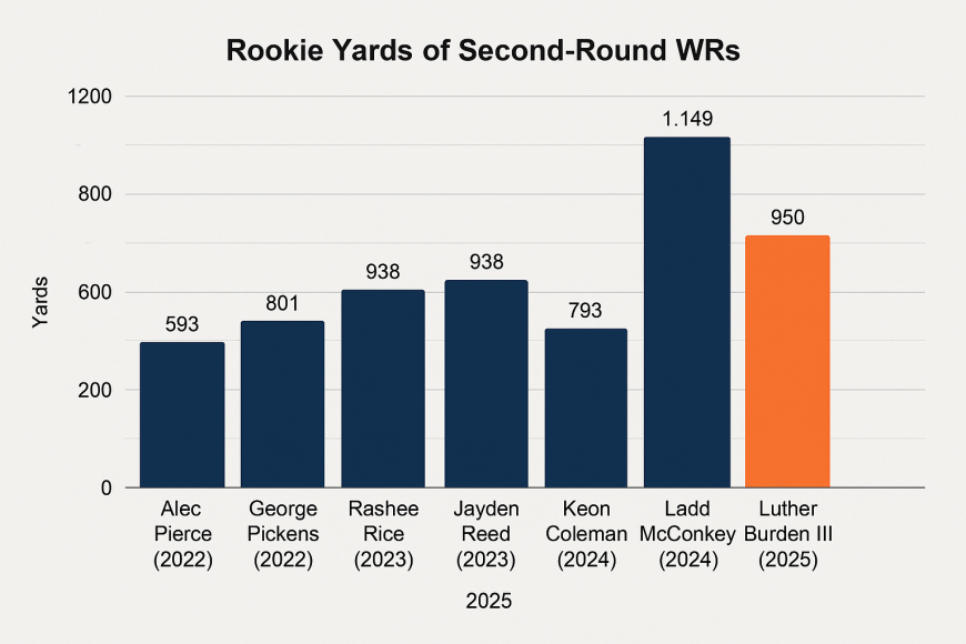 Luther Burden III’s Yard Projections vs. Rookie Yards of Second Round Wide Receivers (2022-2024)