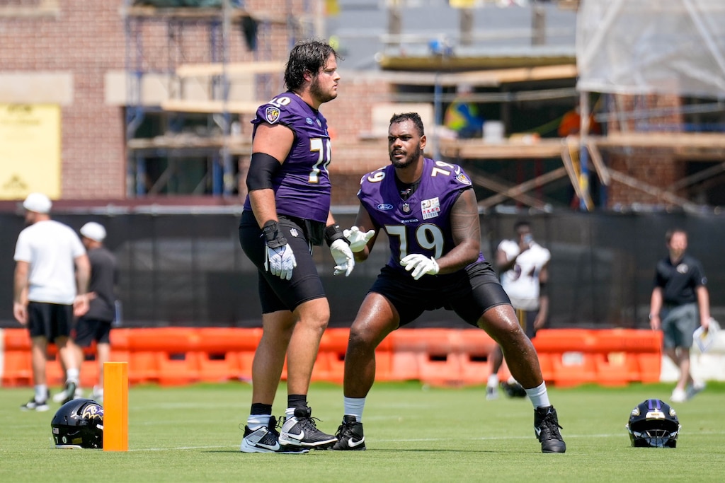 Roger Rosengarten (70) and Ronnie Stanley (79) finish a workout earlier this month. (Ulysses Muñoz/The Baltimore Banner)