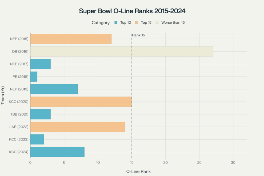 Let’s drop the intro: if you can’t win in the trenches, you can’t win rings. Look at the last ten Super Bowl champs (2015–2024): 9 out of 10 had offensive lines ranked 15th or better, 6 of them broke into the top‑10. That’s not coincidence — it’s the blueprint.