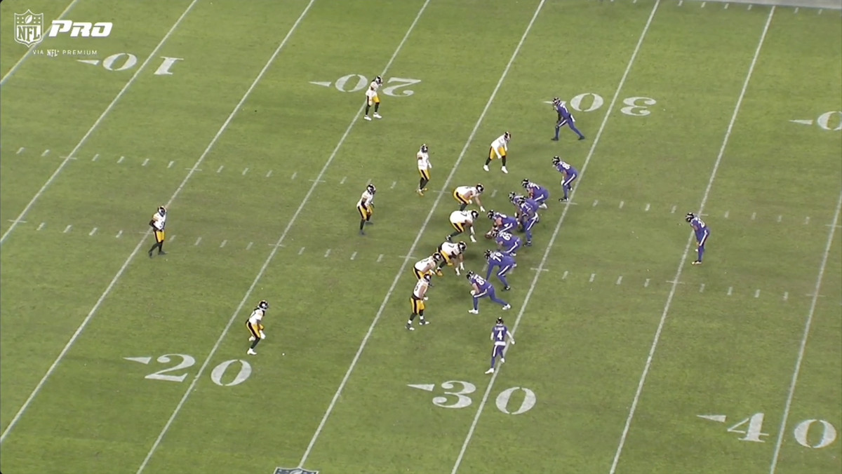In 12 personnel (two tight ends, one running back) and up two scores late in the fourth quarter, it’s pretty clear right off the bat that the Ravens are focusing on the run game. And the Steelers seem aware, with four defensive linemen on the field to go along with four linebackers.