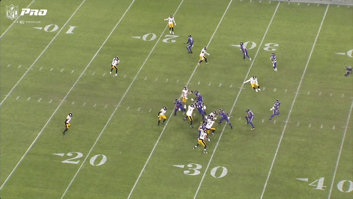 What’s interesting is that the Ravens try a near-identical play on the next snap (yep, you’re hearing about THREE plays in this edition of “One random Steelers play). This next snap serves as an alternate reality of what could’ve happened on the first play had the Pittsburgh defense done a better job.