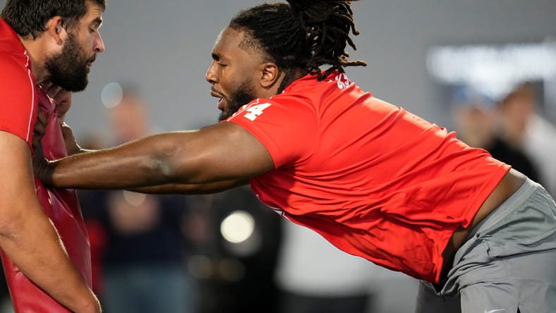 Ohio State Buckeyes offensive lineman Donovan Jackson (74) pushes offensive lineman Josh Fryar while running a drill during the pro day for NFL scouts at the Woody Hayes Athletic Center on March 26, 2025.