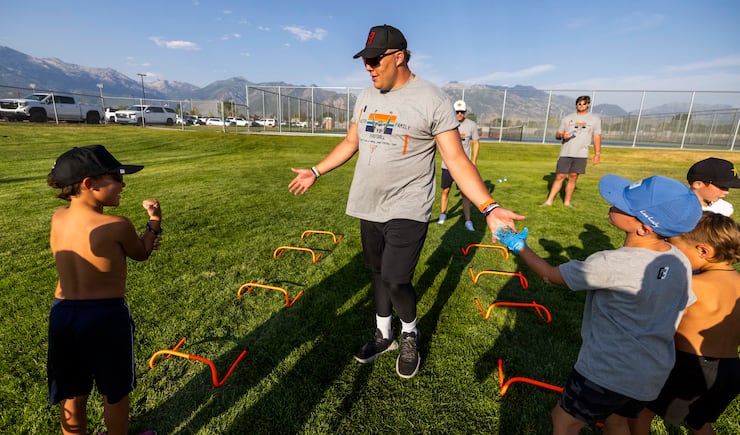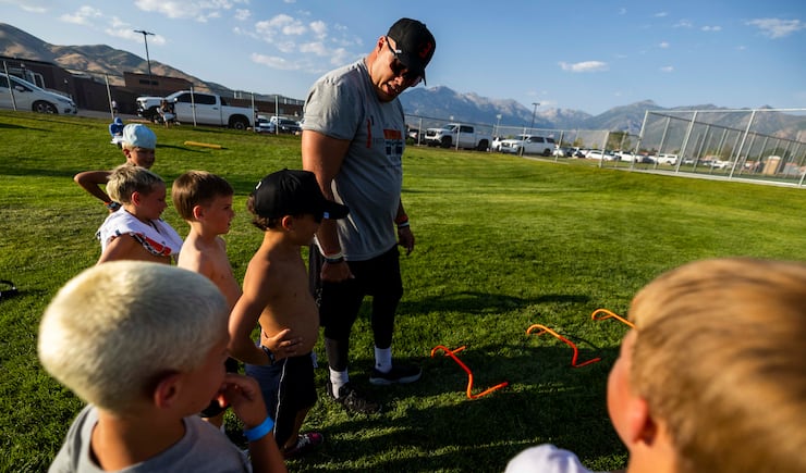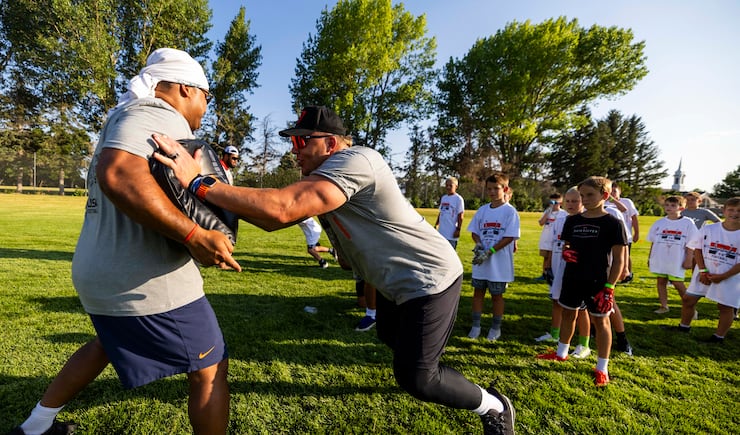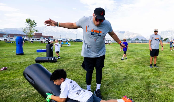 Denver Broncos offensive tackle Garett Bolles helps run a drill during his Youth Football Camp at Skyridge High School in Lehi on Thursday, June 26, 2025. | Brice Tucker, Deseret News