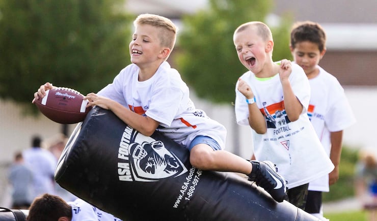 Nash Shelley, 8, on the right, laughs as his friend Stratton, left, participates in a tackling drill during Denver Broncos offensive tackle Garett Bolles’ Youth Football Camp at Skyridge High School in Lehi on Thursday, June 26, 2025. | Brice Tucker, Deseret News