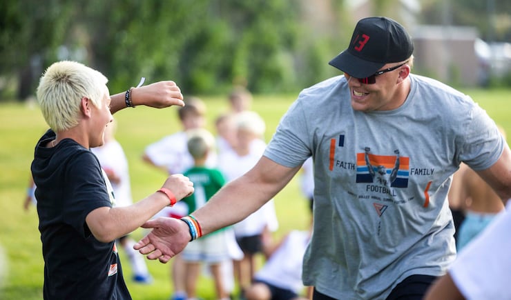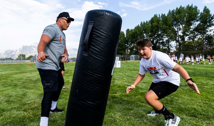 Denver Broncos offensive tackle Garett Bolles, left, encourages Madden Naumann, 11, from Lindon, right, during Bolles’ Youth Football Camp at Skyridge High School in Lehi on Thursday, June 26, 2025. | Brice Tucker, Deseret News