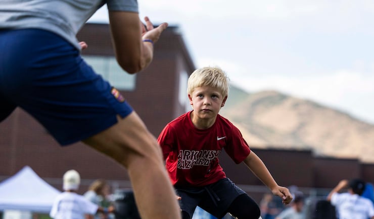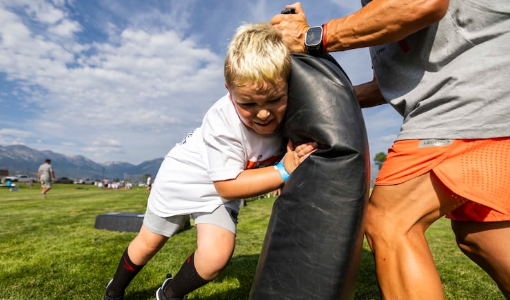 Bown Bridgewater, 8, takes part in a tacking drill during Denver Broncos offensive tackle Garett Bolles’ Youth Football Camp at Skyridge High School in Lehi on Thursday, June 26, 2025. | Brice Tucker, Deseret News