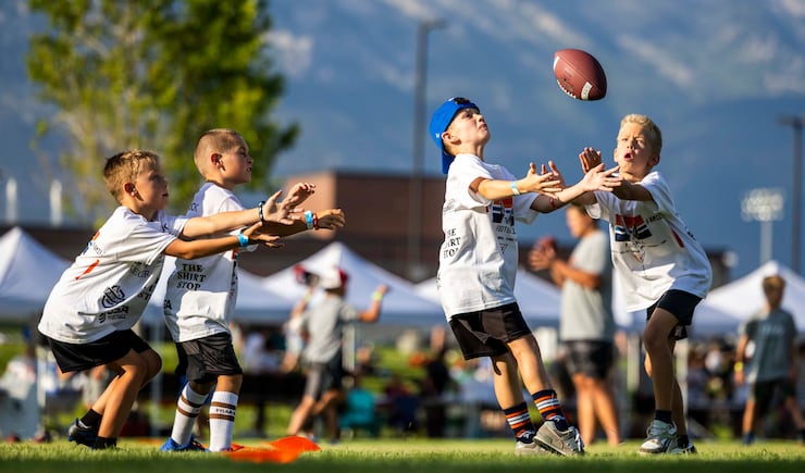Kids battle for the ball during Denver Broncos offensive tackle Garett Bolles’ Youth Football Camp at Skyridge High School in Lehi on Thursday, June 26, 2025. | Brice Tucker, Deseret News