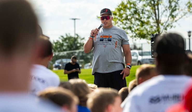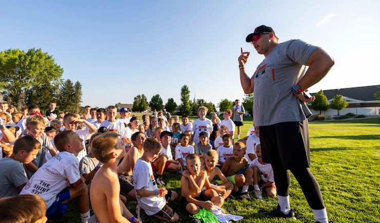 Denver Broncos offensive tackle Garett Bolles talks to kids at the conclusion of his Youth Football Camp at Skyridge High School in Lehi on Thursday, June 26, 2025. | Brice Tucker, Deseret News