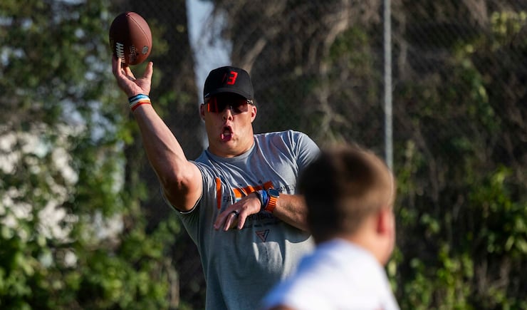 Denver Broncos offensive tackle Garett Bolles throws a pass during a drill at his Youth Football Camp at Skyridge High School in Lehi on Thursday, June 26, 2025. | Brice Tucker, Deseret News