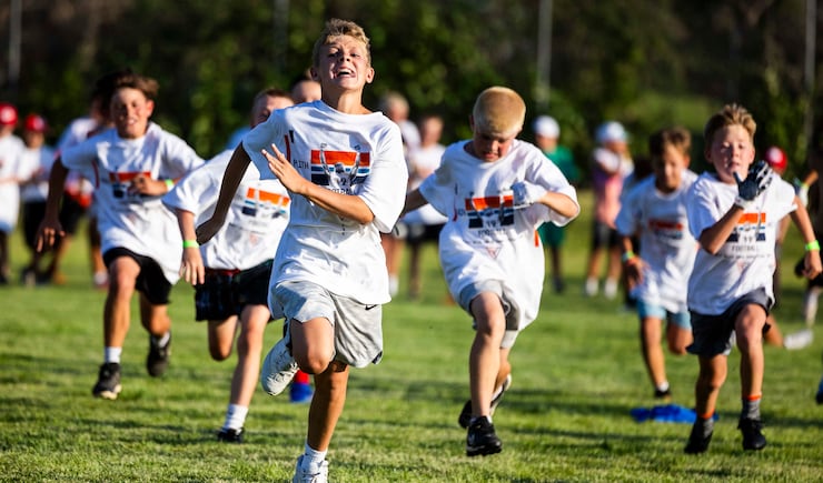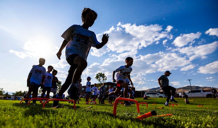 Kids race each other to see who is fastest during Denver Broncos offensive tackle Garett Bolles’ Youth Football Camp at Skyridge High School in Lehi on Thursday, June 26, 2025. | Brice Tucker, Deseret News