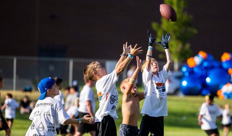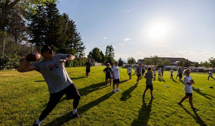 Denver Broncos offensive tackle Garett Bolles throws a pass to a kid during his Youth Football Camp at Skyridge High School in Lehi on Thursday, June 26, 2025. | Brice Tucker, Deseret News
